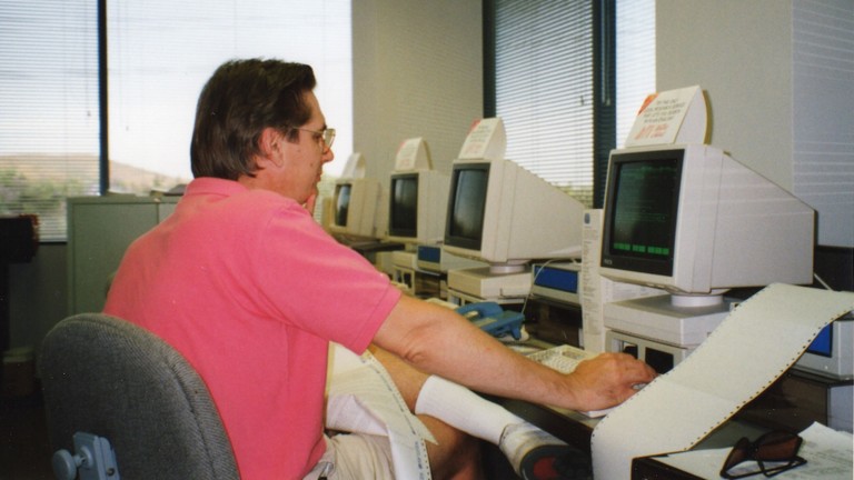 Researching on a Westlaw terminal, with a sign for “WIN: Westlaw Is Natural" that says "Try the only legal research service that lets you search in plain English!" Irvine, 1993.