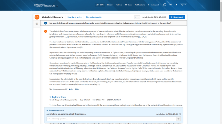 AI-Assisted Research on Westlaw Precision harnesses the power of generative AI — grounded in Westlaw’s trusted content — to quickly create new, relevant answers to legal professionals’ questions. This capability jumpstarts their research, helping customers complete it more efficiently and make more well-informed decisions.