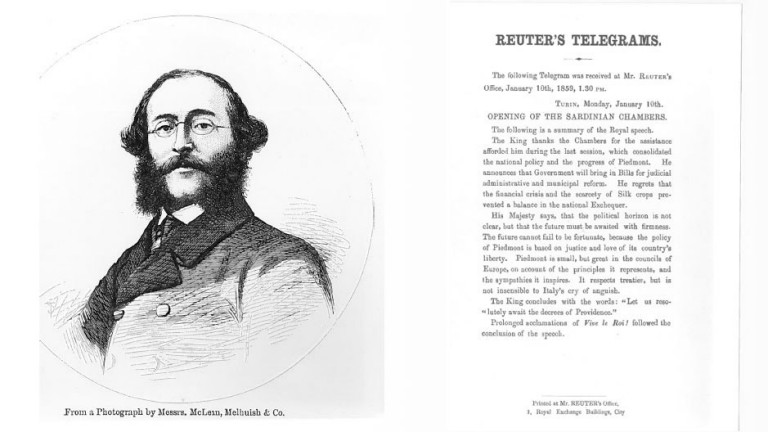 A German-born immigrant, Paul Julius Reuter arrives in London from Aachen where he has been running a news and stock price information service. Using a combination of technologies – including telegraph cables and a fleet of carrier pigeons that grows to exceed 200 – Reuter establishes an enviable reputation for speed, accuracy, integrity and impartiality.
