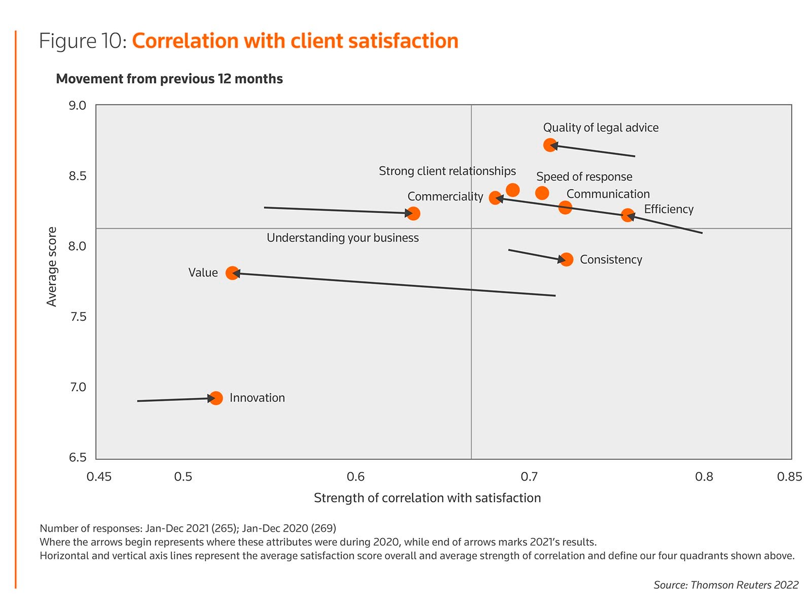 Yet, how these buyers envision the relationship between themselves and their outside counsel in regard to legal service is becoming more complex. While efficiency correlates most strongly to client satisfaction, according to our data, consistency and innovation also provide opportunities for law firms to differentiate themselves from their competition.